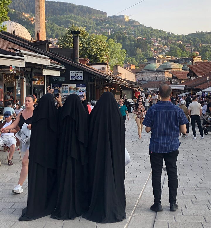 I don’t mean to be schematic, and indeed, I could see for myself that sometimes the two groups overlapped. Strolling through Bascarsija in the evening, for example, feeding the pigeons, laughing at the antics of the Turkish ice cream vendor: in those places, it was a mix of Saudis and Swedes, halter tops and burqas.
